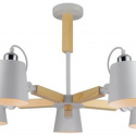 оригинальный светильник, который по достоинству оценят любители современных и уютных интерьеров. в осветительном устройстве удачно сочетаются конструктивные элементы из дерева и металла. каждый из 5 плафонов в виде усеченного конуса имеет боковое крепление к рожку оснащённое шарнирным узлом. данное решение позволяет изменять направление потока света для каждого источника отдельно. общий цвет люстры белый, который органично будет смотреться в любом помещении.
