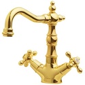 Назначение: для умывальника • Конструкция: двухрычажный • Монтаж: горизонтальный • Материал: покрытие - золото • Монтажные отверстия: 1 отверстие • Форма излива: традиционная • Душевая лейка в комплекте: нет • Донный клапан в комплекте: есть