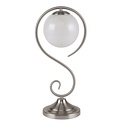 Настольная лампа декоративная стиля модерн для гостиной, кабинета или спальни имеет размеры 200x430 мм. Арматура светильника окрашена в серебрянный цвет. Лампы в комплекте - отсутствуют. В светильнике применяются лампы накаливания или светодиодная LED-лампа. Цвет плафонов - белый, с матовой поверхностью. Материал плафонов - стекло. Класс электробезопасности - II, степень пылевлагозащиты (IP) - 20. Максимальная мощность лампы (Вт) - 40. Светильник размещается на столе.