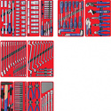Комплектация1/2" Головки и принадлежности, 1/2" Головки глубокие, 1/4" Головки и принадлежности, отвертки, ключи L-типа, магнит, шарнирно-губцевый инструмент, ключи комбинированные, ключи накидные, ударно-режущий инструмент, вставки (биты) 10 мм и принадлежности, съемники для стопорных колец, шарнирные 12-гранные ключи