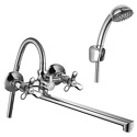 Длина излива - 320, Комплектация - Держатель душевой лейки, душевой шланг, ручной душ, Тип - Двухзахватный, Встраиваемый - Нет, Назначение - Для ванны и душа, Количество монтажных отверстий - 2, Материал корпуса - Латунь, Покрытие - Хром, Термостат - Нет, Аэратор - Есть, Присоединительный размер - 1\2", Высота - 10.4, Форма излива - Традиционная, S-образные эксцентрики - Есть, Тип подводки - Жесткая, Цвет - Серебристый, Ширина - 22.1, Поворотный излив - Да, Донный клапан - Нет, Глубина - 12.15